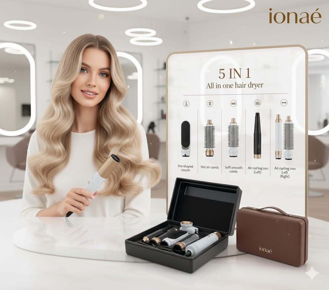 5 accessoires: brosse lissante, fer à boucler, peigne, lisseur et séchoir.